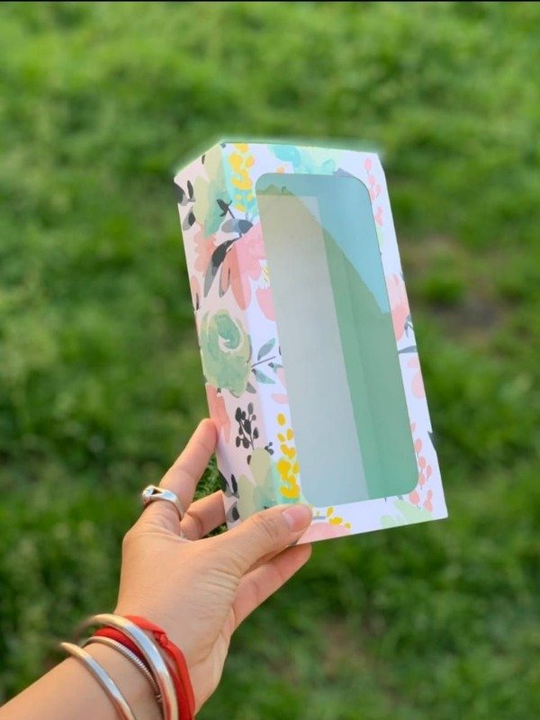 Caja de cartulina estampadas con tapa visor . Medida aprox 20 x 10 x 5 cm