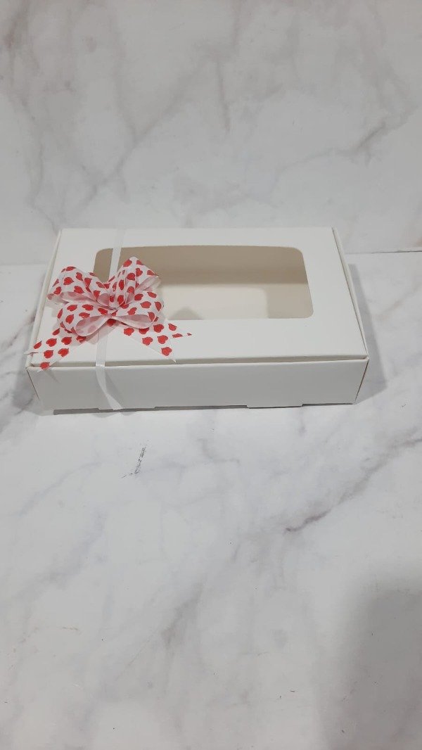 Caja de cartulina blanca con visor ideal para bombones o cookies. Medida 14 x 9 x 3 cm .