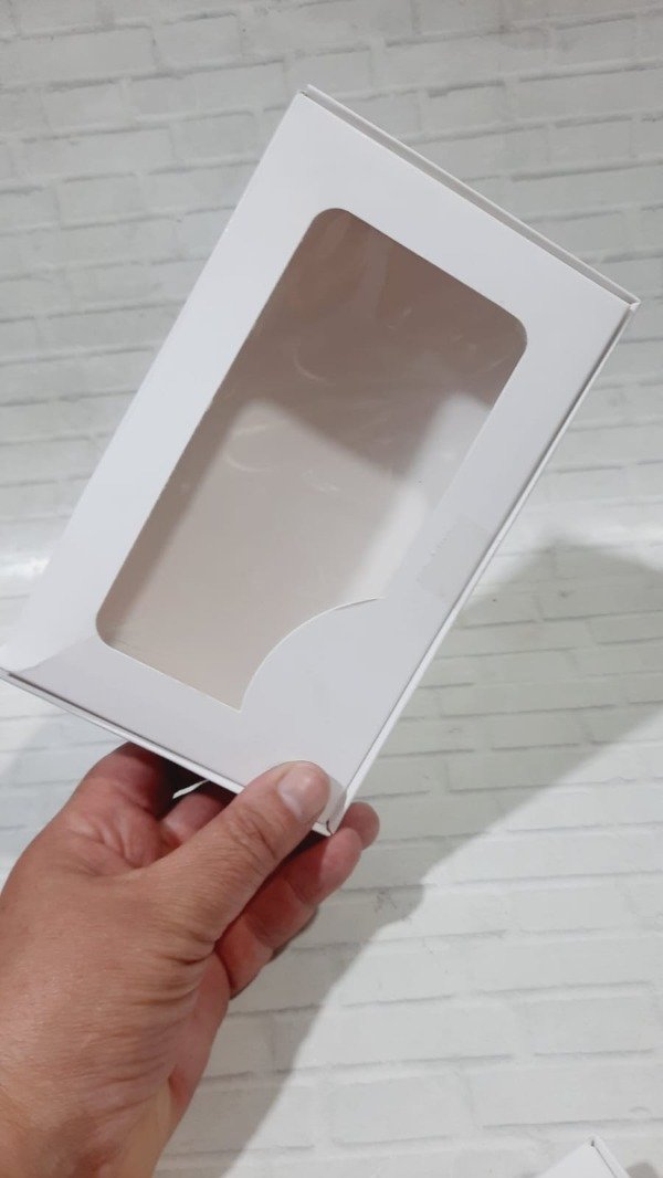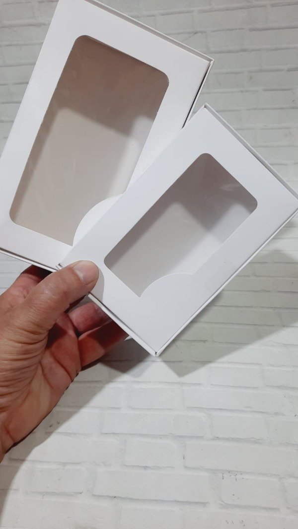 Caja de cartulina blanca con visor ideal para bombones o cookies. Medida 18 x 11 x 3,5 cm .